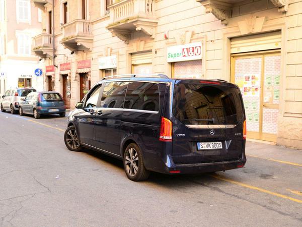 In der Stadt haben sich die Abmessungen von 5,14 Meter in der Länge (Langversion) als nicht ganz unkompliziert herausgestellt. Die Parkplatzsuche gestaltete sich etwas langwierig. Bei dem Platzangebot nimmt man das aber gerne in Kauf. Nachdem sich das Laden als recht einfach herausstellte geht es los gen Süden. Mit 190 PS und ein früh anliegendem Drehmoment (1400 U/Min) von satten 480 Newtonmeter lässt sich die Mercedes V-Klasse recht souverän bewegen. Das ist trotz der Leistungsdaten nicht selbstverständlich, denn dieser Van (Nein, es ist kein Bus) bringt schon leer 2180 Kilogramm auf die Waage. Mit der Extraausstattung, fünf Personen (genaugenommen 3,5 Personen gewichtsmäßig) und dem ganzen Gepäck sind wir mit geschätzten 2,5 Tonnen unterwegs. Zuladung ist übrigens bei der Mercedes V-Klasse kaum ein Thema. 690 Kilo schultert der Stuttgarter locker und aufs Dach (Reling kostet extra) dürfen nochmal bis zu 150 Kilogramm. Gleichzeitig ist die V-Klasse nicht unkomfortabel. Allzu hart wäre bei der Zuladung auch nicht angesagt, und schließlich reden wir immer noch über einen Mercedes. Doch trotz Sportfahrwerk sind durchaus Wankbewegungen spürbar. Zur Seite ist das selbstverständlich bei der Höhe von fast zwei Metern. Aber die V-Klasse geht auch in die Knie beim Bremsen und in die Höhe beim Anfahren. Alles aber im grünen Bereich.