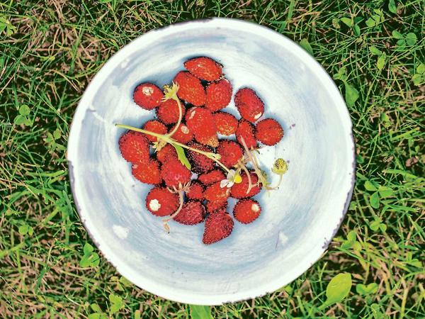 Im Supermarkt gibt es sie natürlich alle schon als Importware: Blau-, Him-, Brom- und Erdbeeren. Aber wer's, wie ich, nicht lassen kann, weil die Gier nach Frühsommer und Sonnenaromen einfach zu groß ist, kauft sich schon mal ein paar unsinnig teure, unter Folie gezogene deutsche Erdbeeren am Obststand. Erstmal dran schnuppern, wenn sie intensiv duften, halten sie meist auch, was die Nase verspricht. Ich hatte Glück: Zucker dran, einen kleinen Schuss Sahne drüber, frisches Butterbrot dazu - mmh! - wie früher daheim im Garten.
