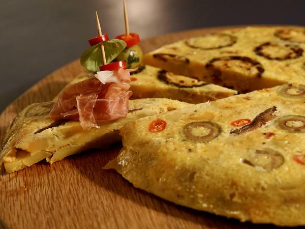 Mir ist vor allem wichtig, dass sie gut aussieht. Deshalb arrangiere ich verschiedene Zutaten in die Pfanne, bilde Regionen, weil der Jüngste Sardellen nicht so mag, dafür aber Schärfe liebt - die Tortilla macht es jedem recht.