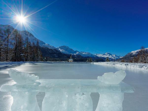 Städter kennen gezähmtes Eis, wenn es in Form kleiner, quadratischer Portionen aus einem Drei- Sterne-Kühlfach in ihre Gläser klonkert. Bevor es an der Bar zu einem Cocktail aufgegossen wird und darin schmilzt. In freier Wildbahn schmilzt ungezähmtes Eis inzwischen auf Gletschern und an den Polen der Erde. Doch nun liegt es hier, hart und prächtig unter den Kufen eines Paares Kunstlaufschlittschuhe. Von zwei „Eismeistern“ tagelang in die Form eines Rechtecks gespritzt, auf 1822 Metern über dem Meer gefroren in Engadiner Alpennächten unter Null.