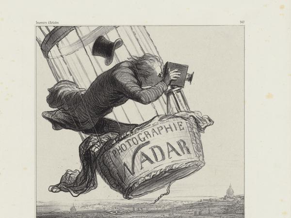 Milden Spott erfährt selbst der berühmte Fotograf Nadar, der doch die erste Ausstellung der Impressionisten in seinen großzügigen Atelierräumen ermöglicht hatte. Er „erhebt die Fotografie auf die Höhe der Kunst“, wie die Zeile unter der Karikatur besagt, die ihn in einer Ballongondel über Paris zeigt, nicht schwebend, sondern stürmend.