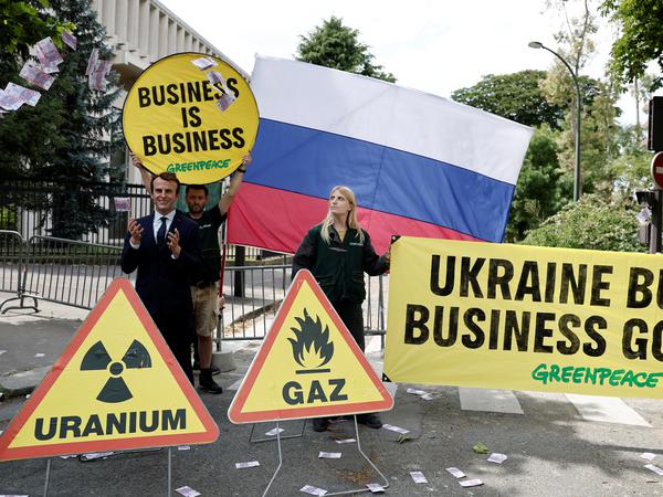 Die Umweltorganisation Greenpeace hat mit einer im Pariser Wachsfigurenkabinett gestohlenen Figur des französischen Präsidenten Emmanuel Macron gegen den Import von Gas und Dünger aus Russland protestiert.