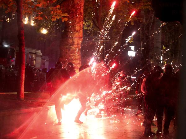 Die Behörden hatten den Einsatz von Pyrotechnik untersagt. Die Einsatzkräfte in Helmen und Schutzausrüstung gingen wegen der Angriffe auf staatliche Einrichtungen immer wieder gewaltsam gegen Protestierer vor und setzten auch Wasserwerfer und Tränengas ein.