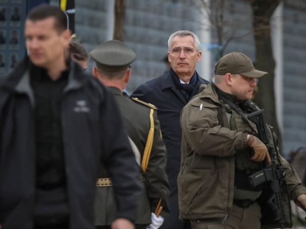 Stoltenberg begann seinen offiziell nicht angekündigten Besuch mit einer Kranzniederlegung zu Ehren ukrainischer Soldaten, die im Kampf gegen russische Streitkräfte im Osten des Landes getötet wurden.