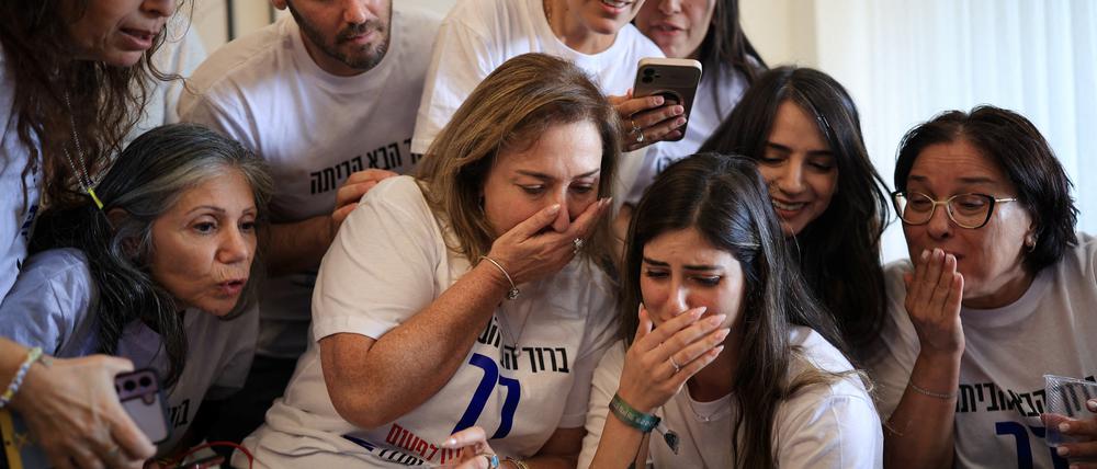 Kurz vor ihrer Befreiung konnten die Geiseln bereits mit ihren Familien telefonieren. Hier sieht man die Angehörigen von Bar Kupershtein. Er arbeitete als Wachmann beim Nova-Festival und bemühte sich um die Rettung anderer Festivalgäste, statt sich selbst in Sicherheit zu bringen.