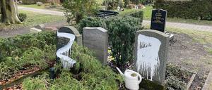 Auf dem Friedhof Wilmersdorf wurden Dutzende Grabsteine beschmiert und umgestoßen. Zu sehen ist dabei das Symbol „Z“ – das als Sympathiebekundung für Russland im andauernden Krieg gilt.