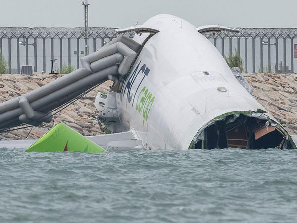 Auf dem Flughafen Hongkong schleudert eine Frachtmaschine über die Piste hinaus – und versinkt zur Hälfte im Meer. Zuvor soll sie ein Fahrzeug auf dem Rollfeld gerammt haben.
