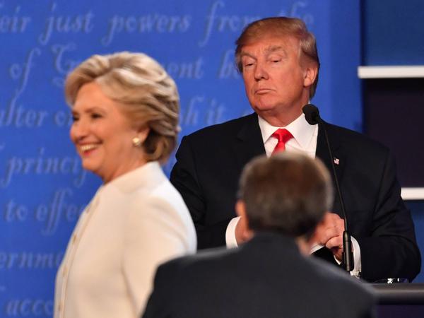 Trump hatte sich in einer Debatte gegen Clinton 2016 zeitweise hinter seiner Konkurrentin aufgebaut und ihr während ihrer Wortbeiträge lauernd im Nacken gestanden. Trumps Verhalten sorgte damals im Netz für einigen Spott.