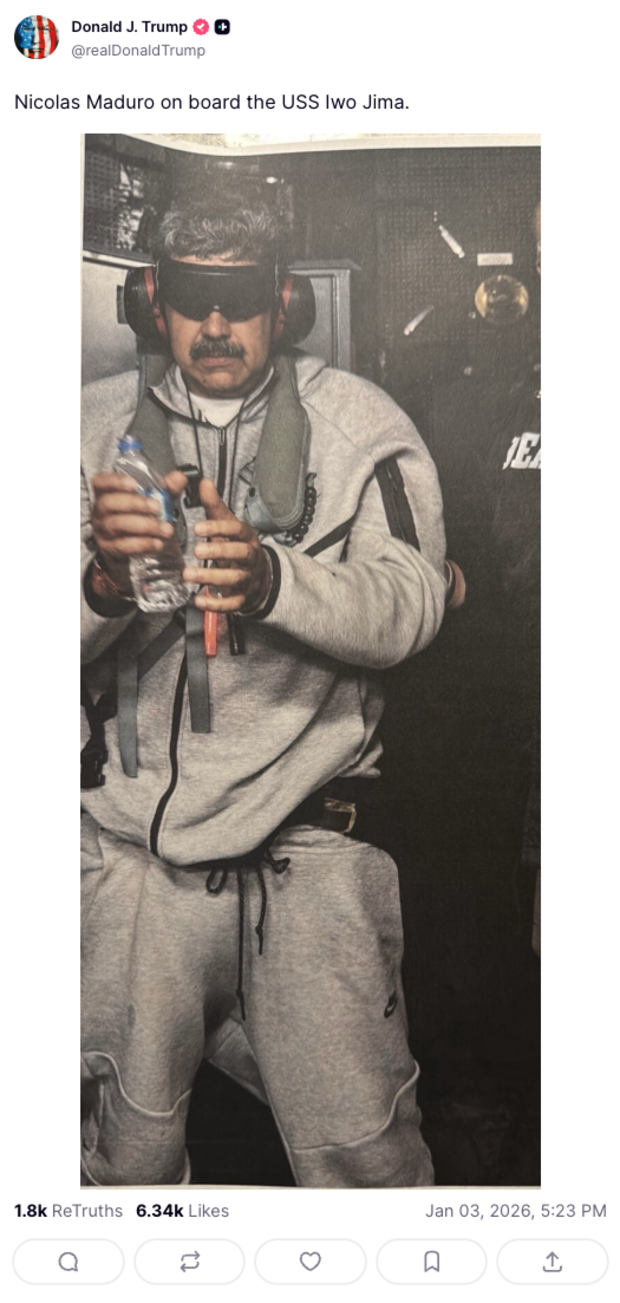 US-Präsident Donald Trump hat ein erstes Bild veröffentlicht, das den gefangengenommenem venezolanischen Staatschef Nicolás Maduro zeigen soll. Auf der Plattform Truth Social postete der Republikaner eine Abbildung, auf der Maduro gefesselt stehend in einem Jogginganzug mit verbundenen Augen und Kopfhörern zu sehen ist. Trump schrieb dazu: „Nicolás Maduro an Bord der USS Iwo Jima.“