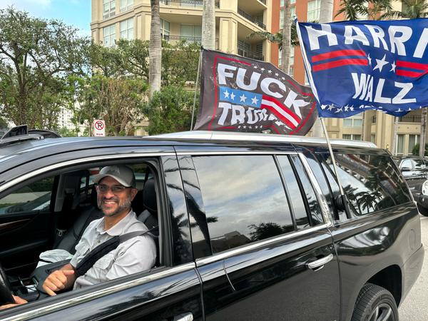 Einen Kontrapunkt setzt da nur Sami Ansari, der mit seinem schwarzen Escalade Cadillac als ungewöhnlicher Gast vor den Toren von Trumps Wahlparty auffällt. „Fuck Trump“- und Harris/Walz-Flaggen wehen von Ansaris Auto.