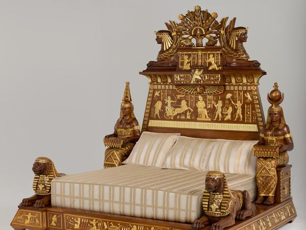 Hier staunen die Besucher über das kolossale Ramses-Bett am Stand der Galerie Marc Maison, das 1889 auf der Pariser Weltausstellung zu sehen war und den Höhepunkt europäischer Ägyptomanie symbolisiert.