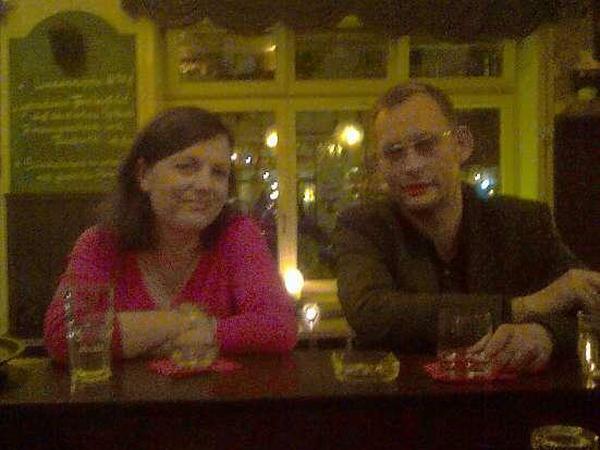 At some point towards midnight a man comes dashing in and asks if the kitchen’s still open. Clemens laughs and tells him to go and get a kebab, but the very nice bar woman says he should go to Ständige Vertretung and explains you always need one place that serves proper food late at night for tired bar staff to go after work. The place near the theatre, I ask, and she’s not sure there’s a theatre there and I try not to hold it against her because I’m too drunk to remember the name of the theatre. Later she takes our picture with my crappy phone, because Clemens’s phone is even crappier than mine. His hair’s very short right now, isn’t it? That’s because he fell asleep at the hairdresser’s.