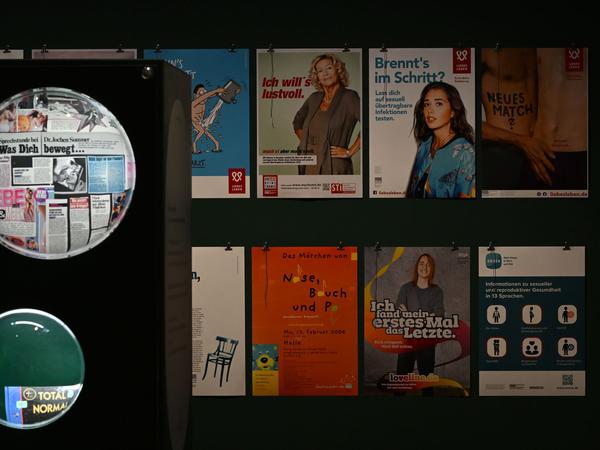 Apropos Aufklärung. Damit befasst sich der nächste, in sachliches Dunkelgrün getauchte Bereich, dessen Szenografie ein Klassenzimmer simuliert. Skizziert wird die Kulturgeschichte der Aufklärung in der Bundesrepublik und der DDR. Vorbei an Sigmund Freuds Modell der sexuellen Phasen, Aufklärungsbüchern und alten Ausgaben der „Bravo“ geht es zu den Vitrinen mit Unterrichtsmaterialien Ost und West. Genau, dieser anatomische Querschnitt durch die weiblichen und männlichen Genitalien kommt einem aus dem Bio-Unterricht bekannt vor. Audios, Videos und Texte, die man per Klick aktiviert, liefern eine Chronologie des Vermittlungsstands zur sexuellen Bildung in beiden Deutschlands.