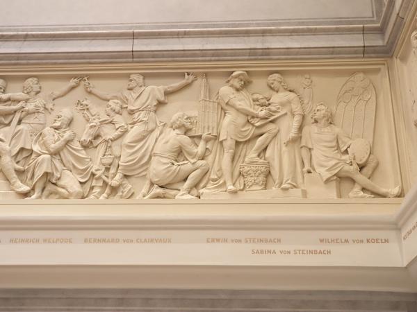 Bei Elzel fällt der Entstehungszeitpunkt des Frieses in die Zeit kurz nach dem deutsch-französischen Krieg. Die Annexion vom Elsass 1871 durch Deutschland war auch mit einer ideologischen Eingliederung verbunden. Mit der Behauptung, das Elsass sei von jeher deutsch gewesen, verband sich der Anspruch auf die Gotik als ur-deutsche Kunstrichtung.