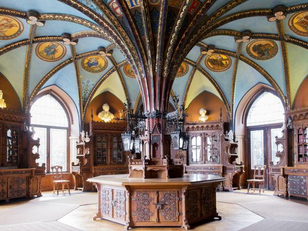 Schon die Eingangshalle überrascht mit Kandelabern, der 14 Meter hohen bemalten Sternendecke und dem wie ein Teppich gestalteten Fußboden aus Mettlacher Kacheln von Villeroy & Boch. Der große Rittersaal im ersten Stock weist an drei Seiten weiße kahle Wände auf, allein die Wand an der Eingangstür ist mit Stofftapeten verkleidet. Dafür lassen sich die drei großen Erkerfenster per Handkurbel absenken, um einen großartigen Blick über die Terrasse auf das Leinetal freizugeben. Im Speisesaal, der hinter Glas geschützt ist, ist für sechzehn Personen gedeckt, an den beiden Gobelins wurde zehn Jahre lang gearbeitet, genauso lange, wie am Schloss gebaut wurde.