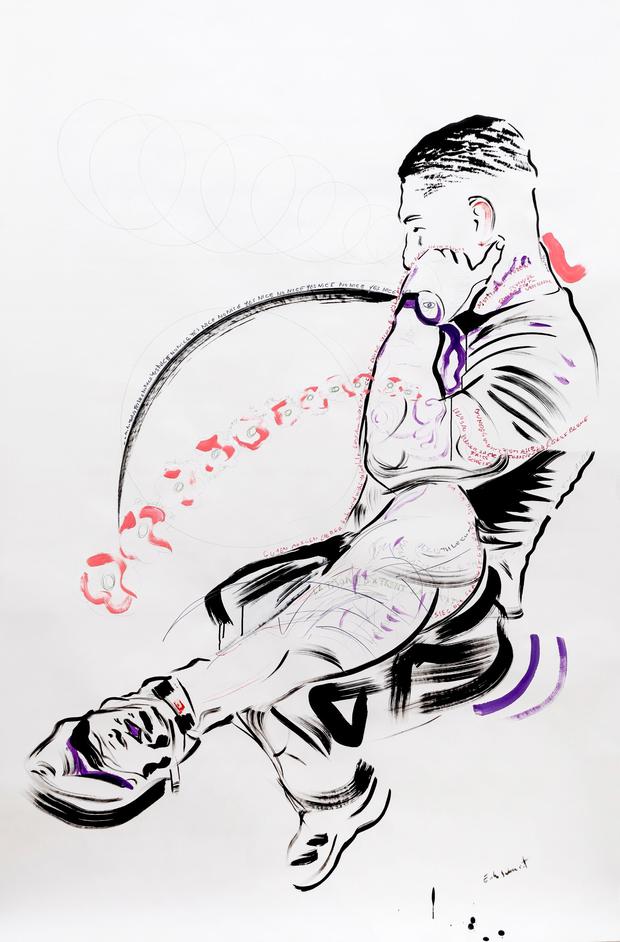 Auf seinen Reisen und bei seinen Künstlerresidenzen spürt Erik Schmidt immer auch die politischen Spannungen und Befindlichkeiten der Menschen am anderen Ort auf. In New York stieß er auf die Occupy-Bewegung, die sich gerade im Zuccotti Park nahe der Wallstreet formierte. Empathisch malte er die Besetzer mit ihren Protestschildern und wie die Polizei sich auf sie stürzt. Als er im vergangenen Jahr den extrem heißen Sommer in Wien verbrachte, porträtierte er mit wenigen Strichen apathisch dasitzende junge Menschen.