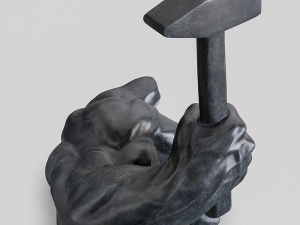 Von Sinn für Wucht und Witz spricht auch Zuzanna Czebatuls gewöhnungsbedürftige Bronze „Andrea II“ (2023). Sie wächst wie ein Superhelden-Bizeps samt Faust aus der weißen Wand und schwingt einen Hammer als gelte es, dem sozialistischen Realismus ein spätes Arbeiter-der-Faust-Denkmal zu setzen.