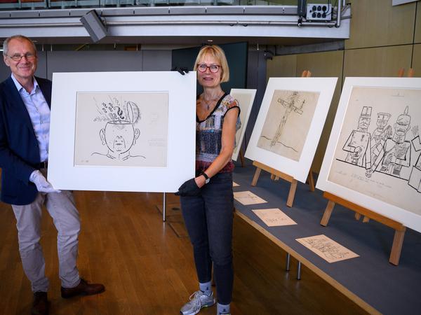 Das geschah schlussendlich nicht, denn viele Jahre später tauchten die Zeichnungen im Nachlass des 1959, vor genau 65 Jahren in Berlin nach der Rückkehr aus dem amerikanischen Exil tödlich verunglückten Grosz wieder auf. Und nun gelang es, dreizehn Blätter für das Archiv der Akademie der Künste für runde 300.000 Euro zu erwerben, dank der Ernst von Siemens Kunststiftung und der Kulturstiftung der Länder.