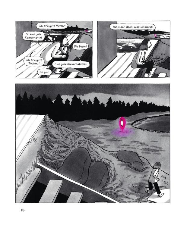 Die Aufgabe, vor der sie steht – innerhalb einer Woche als Alleinerziehende zweier Kinder ein Stück für einen wichtigen Wettbewerb zu komponieren – scheint im Handlungsverlauf der Graphic Novel „Der Zeitraum“ der Autorin und Comiczeichnerin Lisa Frühbeis, der Ende Mai beim Carlsen Verlag erschienen ist, immer unmöglicher.