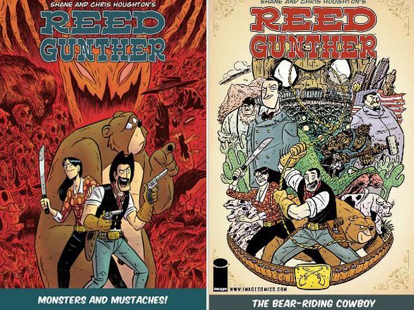Schließlich debütierte „Reed Gunther“ im Sommer 2011 beim amerikanischen image-Verlag, der zu dieser Zeit einigen interessanten Nicht-Superhelden-Titeln eine Chance auf dem übersättigten US-Markt gegeben hat. Die Houghtons und ihre Helden haben diese Chance einstweilen genutzt. Inzwischen gehören Stan Sakai („Usagi Yojimbo“), Guy Davis („B.U.A.P.“) und John Layman („Chew“) zu den prominentesten Fans des Cowboy-Bär-Tandems, das von einem Schlamassel in den nächsten rutscht. Und das hat natürlich seine Gründe.