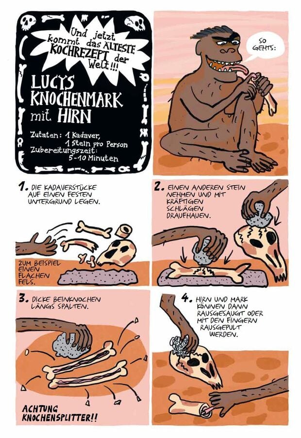 Der Auftakt ist programmatisch: Der Comic beginnt damit, wie Adam und Eva, gerade aus dem Paradies gefeuert, aus blanker Verzweiflung den Bratapfel erfinden. Von dieser Szene springt Steen zurück zur „schimpansenartigen Kost“ früher Hominiden, die im ersten Kapitel beleuchtet wird und schließlich weiter zur Menschwerdung – also dem Moment, in dem Affen zu „kochenden Affen“ wurden.