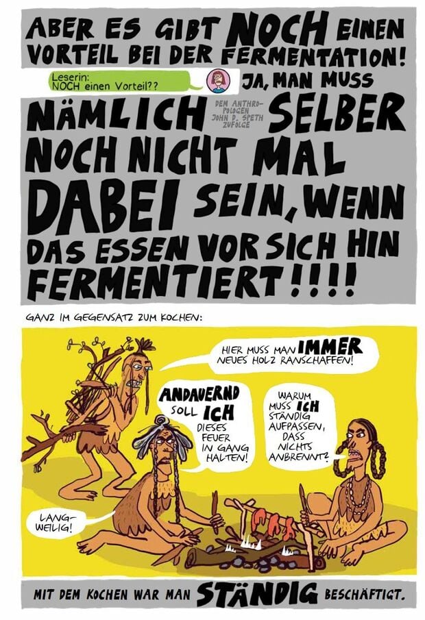 Der Titel des Comics verweist deutlich auf Richard Wrangham, der in „Catching Fire“ wie folgt argumentierte: Erst das Kochen ermöglichte das große Gehirn, die Mobilität, die soziale Komplexität des Menschen. Gekochte Nahrung ist leichter verdaulich, energiereicher, weniger gefährlich; sie befreite unsere Vorfahren von den sechsstündigen Kaumarathons anderer Primaten.