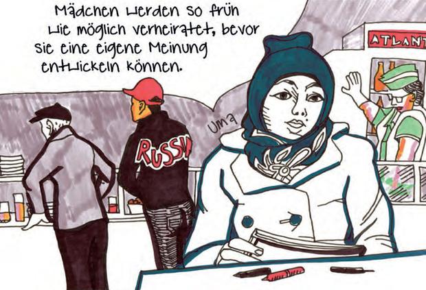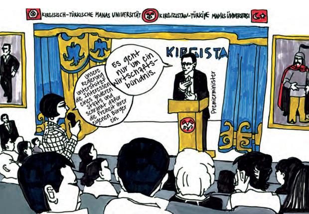 Das Frauenbild in der Sowjetunion war fortschrittlicher und manche der Älteren erinnern sich noch daran: „Nur meine Großmütter möchten, dass ich weiter zur Schule gehe, und sie freuen sich, wenn ich kurze Kleider trage“, sagt eine Kirgisin gegenüber Lomasko.