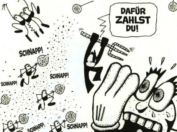 Solche Ökokunst macht Kindern die Welt begreiflich und spielt gleichzeitig so viele Fragen des Zusammenlebens durch, dass es auch für Erwachsene eine reine Freude ist. Die Zeichnungen sind sehr einfach gehalten und setzen auf Putzigkeit. Professor Garbanzo etwa, der die Wissenschaft verkörpert und permanent daran herumtüftelt, in welcher Kombination die vier Grundlagen neue Werkzeuge ergeben könnten, guckt mit großen Augen unter seiner Zaubererzipfelmütze hervor. Die Hoi Polloi grimassieren, was das Zeug hält, und die Bohnen zappeln mit ihren zierlichen Ärmchen und Beinchen so manisch herum, dass die Bohnenwelt nicht nur zu vibrieren scheint, wenn die Wummer-Band einen Gig spielt. Und aus der ausgezeichneten Übersetzung von Daniela Seel und Dirk Schwieger ploppt immer mal wieder wie ein Stummelspross vom Lebensbaum eine Sprachperle heraus: „Von drinnen: ein dünnes Wimmern, das sich zu Wut verdickt.“