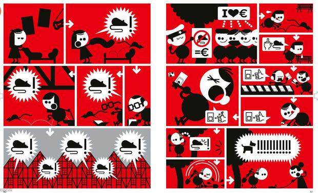 Dazu braucht Flöthmann nicht mehr als ein paar typisierte, simple Figuren und Sprechblasen mit Piktogrammen, Satzzeichen oder Icons mit hohem Wiedererkennungswert: Ein „Daumen hoch“ steht für Einverständnis oder Lob, ein „Kackhäufchen“ signalisiert Ablehnung oder Pannen, ein durchgestrichener Lautsprecher mit Ausrufezeichen bedeutet Stille. Derart eingedampft schnurrt die fast 300 Seiten starke Erzählung „Tarzan bei den Affen“ schließlich auf 15 Seiten Comic zusammen.