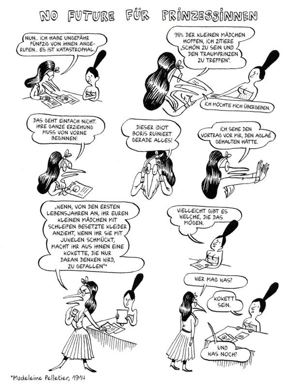 Wobei für mich die Szene „No Future for Prinzessinnen“ klar den ein- bis zweideutigen Höhepunkt darstellt: Hier wird das Verhältnis zwischen Bekleidungsstilen, damit verbundenen Erscheinungsbildern plus mit diesen einhergehenden gesellschaftlich zugewiesenen Rollen aufs Komischste durchgenommen, dabei souverän meilenweit von den bemüht-verbissenen Aufklärungspamphleten der Konkurrenz entfernt bleibend, weil frau nicht nur etwas Eigenes zu sagen hat, sondern überdies exzellent fabulieren kann.