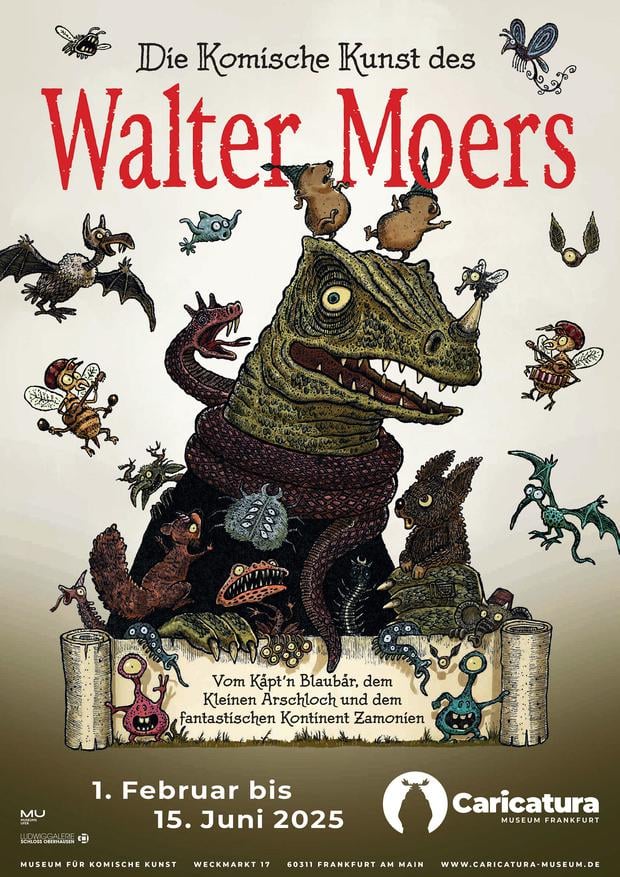 Das Caricatura-Museum in Frankfurt am Main zeigt Werke des Comiczeichners, Illustrators und Schriftstellers Walter Moers. Die Ausstellung „Die Komische Kunst des Walter Moers“ präsentiere vom 1. Februar bis 15. Juni zahlreiche Originalillustrationen und unveröffentlichte Skizzen, teilte das Museum für Komische Kunst mit: „Ob Käpt n Blaubärs Lügengeschichten, der zutiefst schwarze Humor des Kleinen Arschlochs oder der fantastische Kontinent Zamonien, es gibt viel zu entdecken im Kosmos des Walter Moers.“