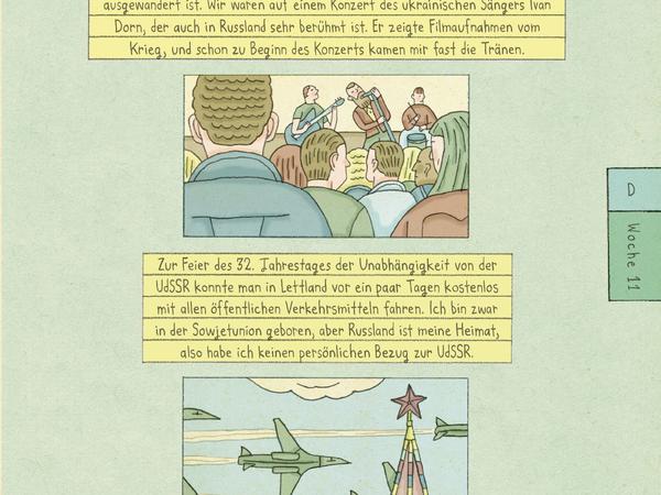 Um 18 Uhr spricht dann die deutsch-amerikanische Illustratorin Nora Krug über ihr Buch „Im Krieg“, in dem sie Alltagserlebnisse aus der Ukraine und Russland verarbeitet hat. Und um 19 Uhr präsentiert der österreichische Comic-Minimalist Nicolas Mahler seine von Franz Kafka inspirierten Werke. Parallel dazu gibt es eine „Artist Alley“, in der Berliner Comicschaffende und Verlage ihre Werke präsentieren, signieren und verkaufen. Das Ticket für das gesamte Graphic-Novel-Day-Programm kostet 18 Euro, Karten für die einzelnen Gespräche gibt es für 5 Euro.