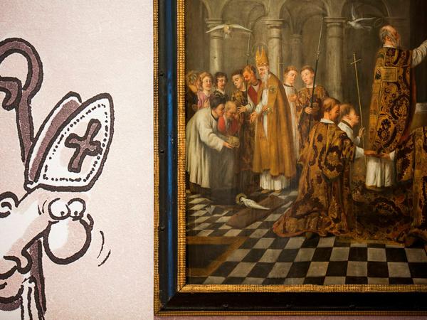 Fromm geht es nicht gerade zu in der Version vom Schicksal der Frauen, die der Legende nach vor den Toren Kölns überfallen wurden. Bei Ralf König ist es aber auch nicht so blutig: „Elftausend Frauen, die kann man ja nicht abschlachten lassen.“ Seine für die Schau extrem vergrößerten Comics stehen in schrägem Kontrast zu den jahrhundertealten historischen Gemälden zum Thema, die auch in der Ausstellung hängen (bis 9.2. 2013). Ein Schreibtisch mit Zeichenstiften und Comic-Bilderfolgen gibt Einblick in den aufwändigen Arbeitsprozess.