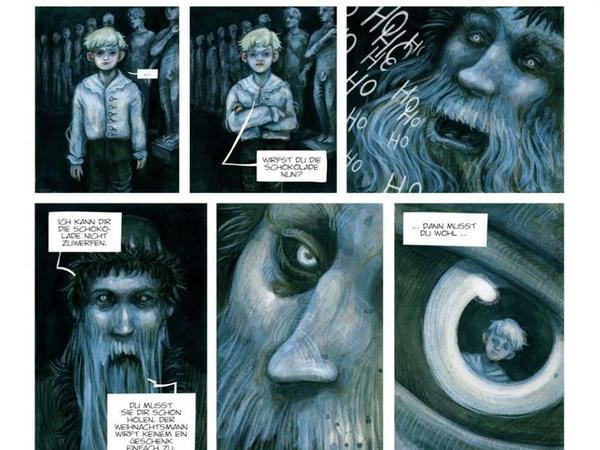 „Der Speichermann“ (Splitter, 72 S., 18€) ist eine bewusst altmodische Geschichte, ein nostalgischer Blick auf die Schauermärchen des 18. und 19. Jahrhunderts, die einem heutzutage ebenso überholt wie der Glaube an den Weihnachtsmann vorkommen könnten. Gleich auf den ersten Seiten tritt man in eine vertrauten Welt ein: verschneite Landschaften, durch die Jäger auf Schlitten fahren, und mittendrin ein altes Herrenhaus.