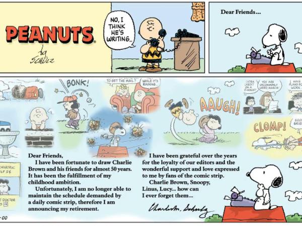 Im September 1999 erklärte er mit fast 77 Jahren das Ende seiner Zeichentätigkeit. Er hatte Darmkrebs - dem 1943 bereits seine Mutter erlegen war. Am 12. Februar 2000 starb Charles M. Schulz. Tags darauf erschien sein letzter „Peanuts“-Strip. (KNA)