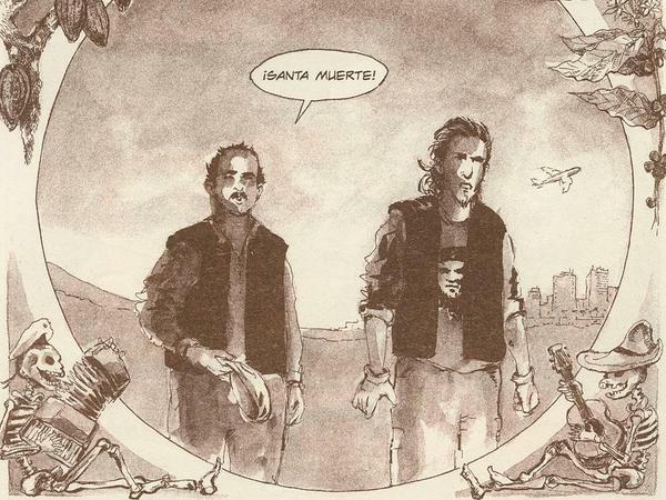 In der Tat nimmt der Comic schon bald nach dem Leichenfund eine psychedelisch anmutende Wendung. Immer wieder gibt es – wie im Prolog – rätselhafte Einsprengsel aus dem Off. Unter Drogeneinfluss und zum Soundtrack von Terry Calliers „Lazarus Man“ beschließt Güero, die Leiche auf dem Seeweg zurück in die Heimat zu bringen. „I come to your country from a faraway land“, so heißt es in den Lyrics.