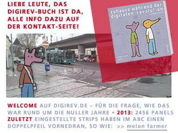 Brötchen mit spitzen Enden, Nazi-Großeltern, Carhartt-Hemden, das letzte Charlotte Roche-Buch, der komische Geruch hinter der Zoo-Mauer – nahezu alles kann Ausgangspunkt für die Comic-Strips von „Zuhause während der digitalen Revolution“ werden. Seit 2005 veröffentlicht Wolfgang Buechs, laut eigener Aussage halbfreier Mediengestalter aus Frankfurt am Main, unter dem Kürzel „Digirev“ seine Alltagsbeobachtungen, lakonischen Gedankenspiele und Gespräche mit Freunden als Webcomic. Seit 2006 erscheint Digirev auch in der linken Wochenzeitung „Jungle World“, im vergangenen Jahr wurde eine Auswahl der Strips als Taschenbuch veröffentlicht.