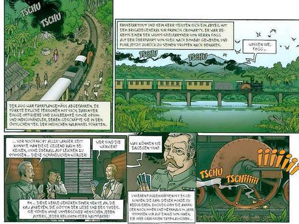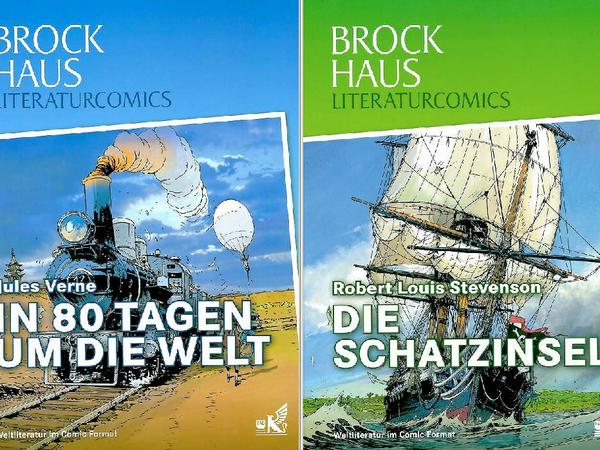 Jetzt, ein paar Jahre später, veröffentlicht auch der mit seinem traditionellen Lexikongeschäft ein wenig in Bedrängnis geratene Brockhaus Verlag eine eigene Comic-Reihe. Unter dem Label „Brockhaus Literaturcomics“ erscheinen Übersetzungen französischer Klassiker-Adaptionen wie „In 80 Tagen um die Welt“, „Die Schatzinsel“ oder „Robinson Crusoe“. Fünf Alben sind bereits erschienen, allesamt rund 58 Seiten dick, Din-A4-groß und versehen mit einem kurzem Anhang zum jeweiligen Thema und Autoren. Im Herbst sollen weitere fünf Bände folgen.