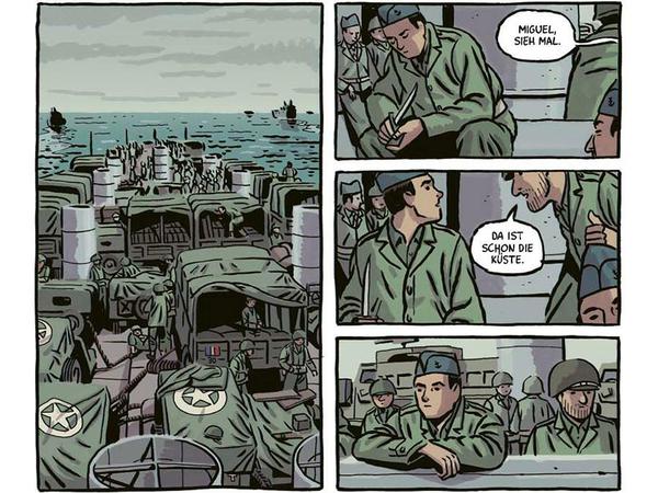 Im Comic wohnt Miguel Ruiz, längst ein alter Mann, in Frankreich und wird von einem jungen Comicautor besucht. Es gibt Kaffee und eine Geschichte, die er, ein Griesgram von 94 Jahren, bis dahin noch niemandem erzählt hat. Das ist typisch. Denn die spanischen Soldaten fühlten sich von den Alliierten betrogen, schließlich wollten sie nicht nur gegen Hitler kämpfen, sondern gegen den Faschismus in ganz Europa. Doch nachdem Hitler besiegt war, hatten die Alliierten kein Interesse mehr daran - Franco blieb an der Macht und die Spanier standen allein da.