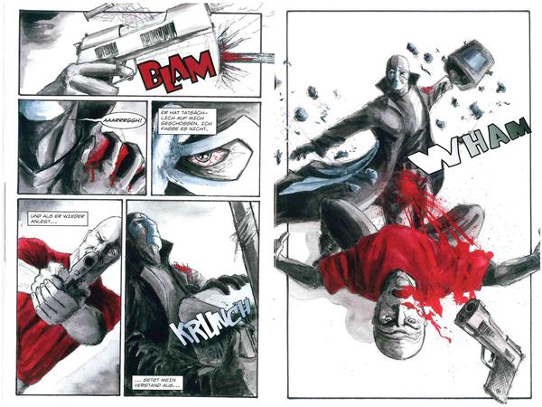 Blau, Rot, Schwarz, Weiß – Tomppas Farbpalette ist klein. Aber seine eindeutige Farbgebung sorgt für Klarheit in den feingliedrigen Zeichnungen. Der Strich ist nicht flüssig, die Gesichter seiner Figuren sind oft kantig, weswegen die Charaktere schnell verschroben wirken. Regen lässt Szenerien verschwimmen, es ist fast ständig düster – überhaupt passt hier vieles gut zu Berlin. Sein wortkarger Superhero ist ziemlich brutal. Für die Visualisierung seiner Sprünge und Fausthiebe sorgt mal grob, mal präzise verwischte, getropfte, gesprenkelte Farbe. Die Perspektiven wechseln ständig, die Heftseiten sind immer wieder anders aufgeteilt, keine Szene wirkt wie die vorige.