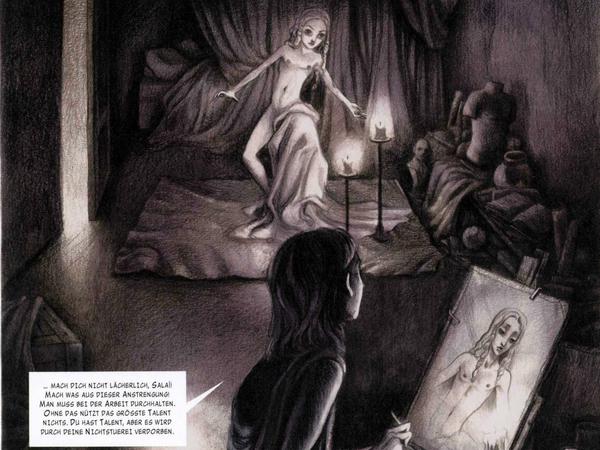 Auch „Leonardo & Salaï“ ist ein Künstlercomic, der sich einiges vorgenommen hat. Einen Leonardo aus „Fleisch und Blut“ zeichnen, wie der Klappentext ankündigt. Das kreative Schaffen eines genialen Geistes ausstellen, wie Text- und Bildzitate suggerieren. Eine Liebesgeschichte zwischen Meister und Lehrling erzählen, wie der Titel verspricht.