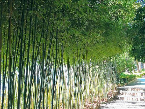 Ein passender Übergang in den exotischen Japanischen Garten. Geharkte Kiesflächen mit Steinlaternen und Steintafeln mit japanischen Gedichten lassen vergessen, dass wir uns in Südfrankreich befinden. Ein Tor aus dicken Bambusrohren und ein kleines Bambuswäldchen erhöhen den exotischen Eindruck.
