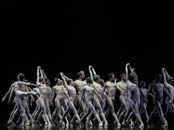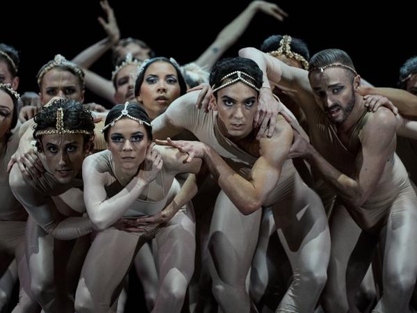 „2 Chapters Love“ von Sharon Eyal schlägt dann sofort in den Bann. Die israelische Choreografin hat ihr Stück „Love Chapter 2“, das sie 2017 für ihre Tanzcompany „L-E-V“ schuf, für das Staatsballett überarbeitet. Die neue Kreation wirkt wie maßgeschneidert. Zu hautfarbenen Trikots tragen hier alle 26 Tänzer ein Diadem aus Strass – im Ballett ist dies nur den Ballerinnen vorbehalten. Die Tanzstücke, die Sharon Eyal zusammen mit ihrem Partner Gai Behar kreiert, sind von der Clubkultur inspiriert.