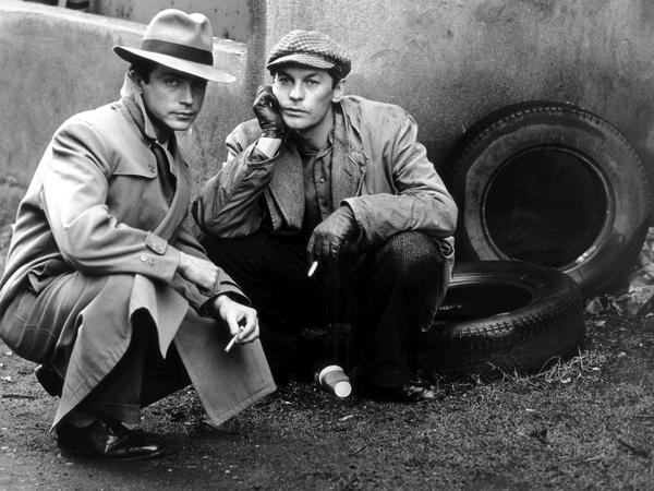 Die Schauspieler Helmut Berger (r) und Udo Kier (l), aufgenommen während der Dreharbeiten zu dem Tessari-Film „Das fünfte Gebot“, 1977.