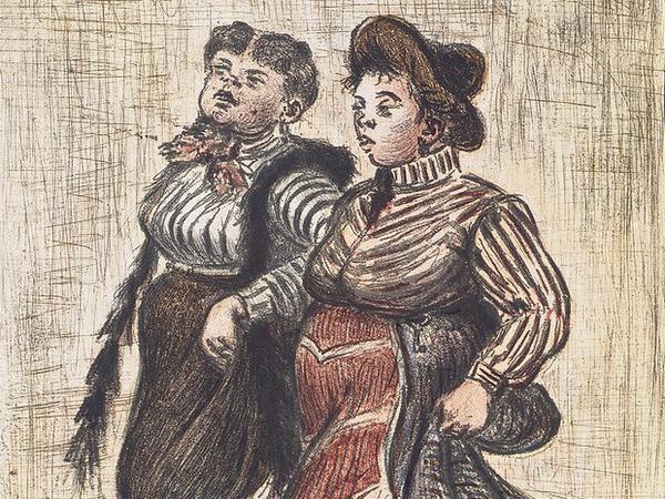 Kuratorin Gabler stellt dabei häufig Original-Skizzen ausgearbeiteten Radierungen oder Druckgrafiken gegenüber. Die schnelle Bleistiftzeichnung fertigte Zille häufig auf der Straße an, fing schemenhaft, aber präzise Motive ein, die er später im Atelier noch mal studierte, verfeinerte. Zum Beispiel Frauen, die mit Kindern an der Hand durch die Straßen laufen – die Eile, das Gehetzte, das Wehen der langen Röcke, es kommt mit wenigen Strichen rüber.