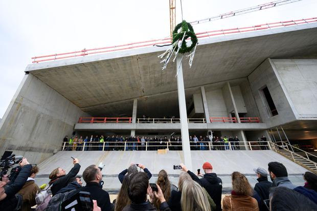 Genau zwanzig Monate sind seit der Grundsteinlegung vergangen, daran erinnerte der Polier in seiner sich reimenden Richtfest-Rede, bevor er mit seinen Vorarbeitern und einer Kollegin das mit Rotwein gefüllte Glas erhob und, nachdem es geleert war, rituell zerschmetterte. Zur Musik von Bläsern der Philharmonie erhob sich dann der zweieinhalb Meter große Richtkranz am Kranseil in die Höhe, dazu regnete es Konfetti.
