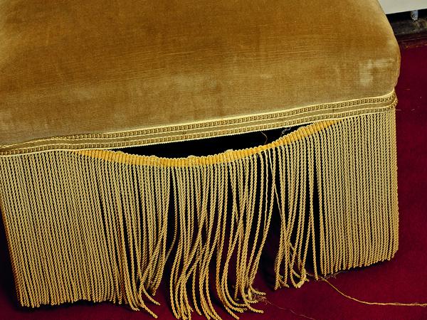 Wie viele Opernfans, von den Wohlklängen enthusiasmiert oder noch ganz benommen, werden wohl schon auf diesem ockerfarbenen Polsterhocker Platz genommen und die Pause zwischen zwei Akten mit einem Glas Sekt begossen haben! Unzählige, man sieht es dem Möbelstück, zu finden im Umgang des 2. Rangs in der Komischen Oper, deutlich an. Eine Naht hat die jahrzehntelange Belastung nicht ertragen, und so hängt die Borte mit den Fransen, die den Hockerfuß kaschieren sollen, etwas schlapp, ja schlampig herab.