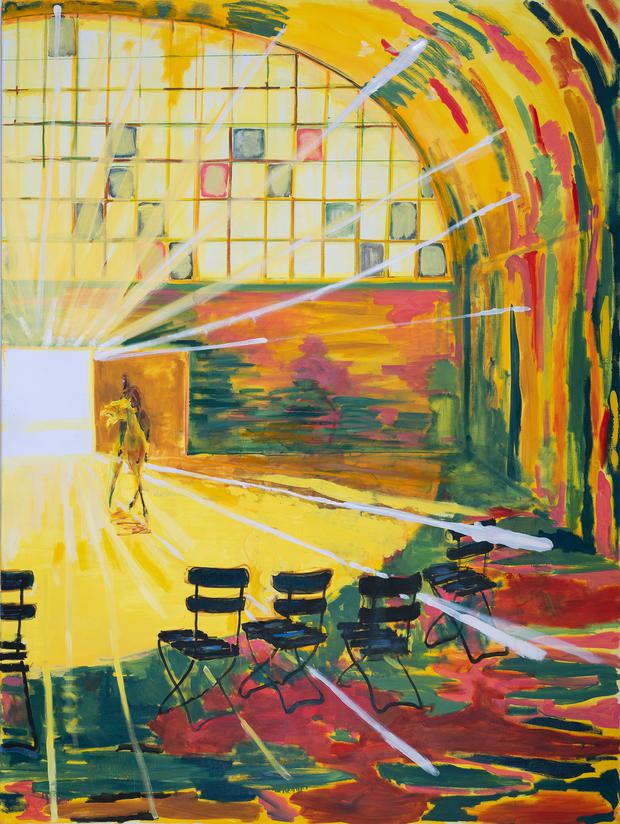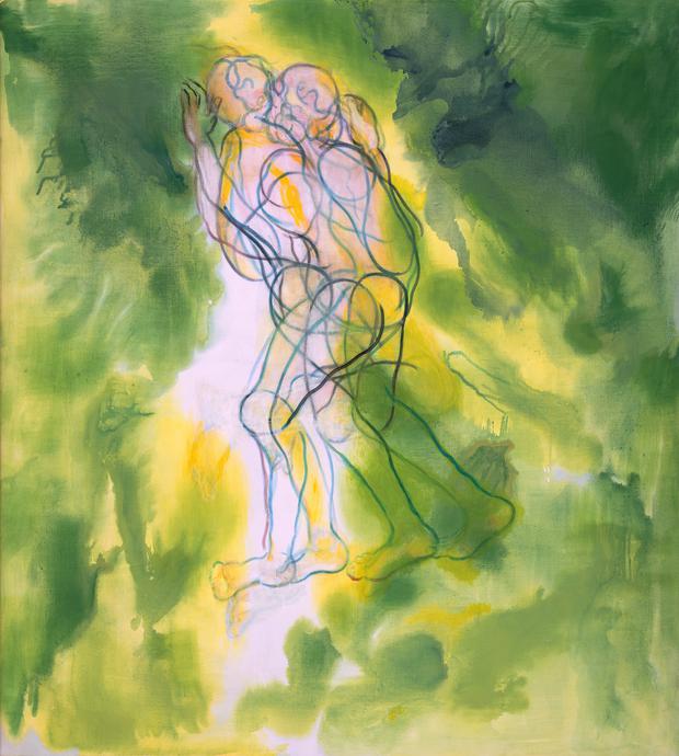 Der betende Körper vorm Kreuz in dem Großformat „Stacheldraht Jesus“ von Sadler erinnert in seiner Schablonenartigkeit an die Arme und Beine, die durch Jakobsdóttirs wolkig, aquarellige Farbuniversen fliegen. Auch die Gestalt in Sadlers Schlafwagen-Bild ist als Umriss gemalt. Ob diese Art der Darstellung aus ihren Bildern in seine hineingesprungen ist, oder umgekehrt? Sadler zieht seine Inspiration aus seinen Reisen, er ist Straßenmusikant, Zirkusgänger, Beobachter, Flaneur. In seinen Bildern in kräftigen Farben wie Blau, Gelb und Rot bindet er die Eindrücke unterschiedlicher Orte und Zeiten zusammen: Paris, Kairo, Kandahar.