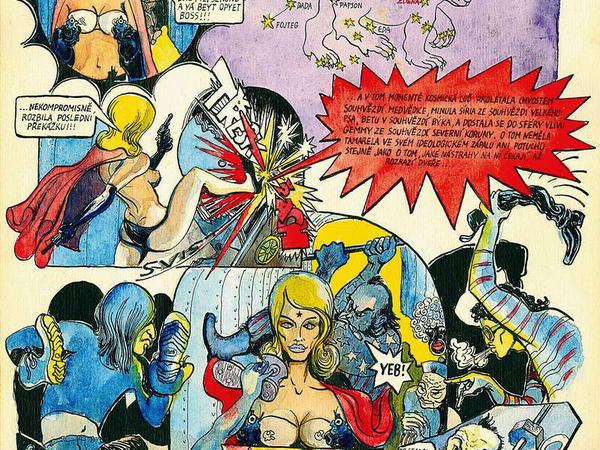 Peng!, Zack!, Uff! – so liest sich der Sound von Comics in Deutschland. In tschechischen Heften steht da eher Prásk!, Haf! oder Švih!. Die dazugehörigen Bilder jedoch, die erzählen meist ähnlich gelagerte Geschichten: von maskierten Helden mit Muskelbergen, die dank Sprungfedern an den Füßen ihren Nazi-Verfolgern entkommen; von großbusigen Frauen, die nur mit Pumps, BH und Umhang bekleidet durchs Weltall reisen und sich mit Knarren den Weg freischießen. Geschichten wie diese entfalten sich vor allem in den Zeichnungen – selbst wenn der Betrachter kein Wort Tschechisch kann.