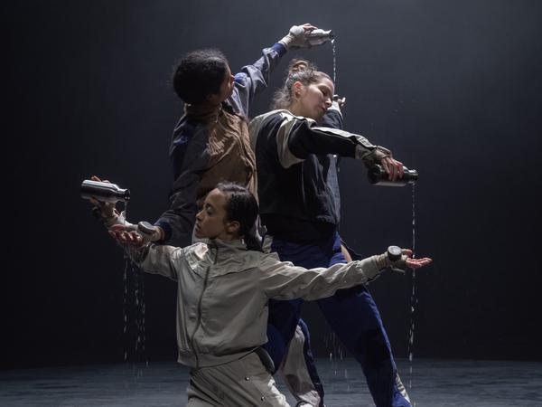 Zu Beginn von „EXIT ABOVE after the tempest“ kommt die Windmaschine zum Einsatz. Im Haus der Berliner Festspiele schwebt eine Plastikplane durch die Luft, verwirbelt sich, bauscht sich auf zur Wolke, die über den Köpfen der Tänzer:innen hängt. Einen Sturm entfesselt die flämische Choreografin Anne Teresa De Keersmaeker nicht in diesem Prolog. Auch ein Bezug zu Shakespeares letztem Stück „The Tempest“ lässt sich auch nicht erkennen. Meskerem Mees, eine Singer-Songwriterin mit äthiopischen Wurzeln. zitiert dann Walter Benjamins Denkbild vom Engel der Geschichte, den ein Sturm unaufhaltsam in die Zukunft treibt. Fast wie ein Engel mutet der Tänzer Solal Mariotte an, er wirbelt herum, beginnt zu zittern und sinkt schließlich kraftlos zu Boden.